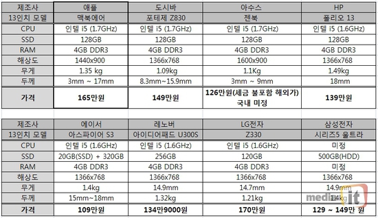 ▲ 13인치의 맥북에어와 비슷한 사양을 지닌 울트라북을 비교했다. 맥북에어와 비교해 울트라북 가격은 비싸지 않았다.