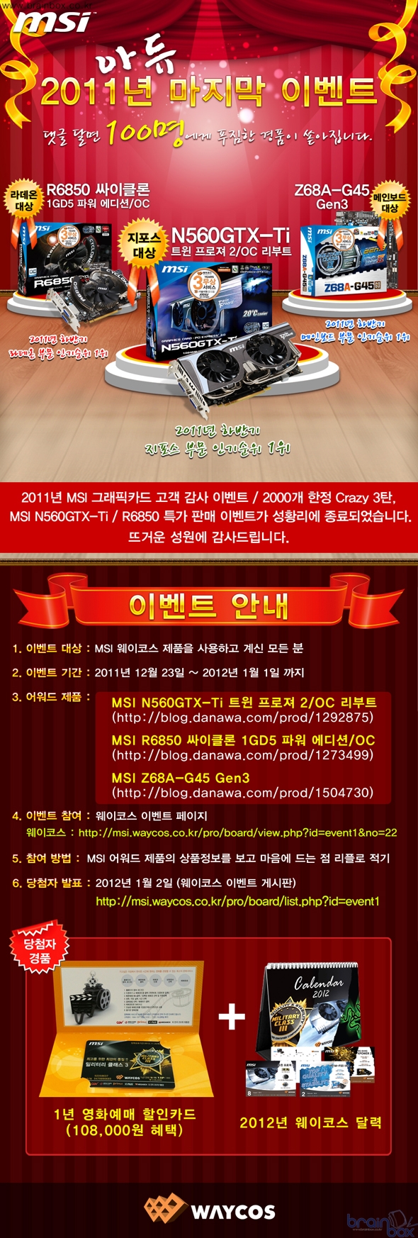 세계 최고의 VGA 제조 기술력을 갖춘, MSI의 한국 공식 디스트리뷰터인 ㈜웨이코스(대표:고민종)가, 2011년을 정리하며 “2011 아듀 !! MSI 웨이코스 마지막 이벤트”를 실시한다. 2011 아듀 !! MSI 웨이코스 마지막 이벤트 실시