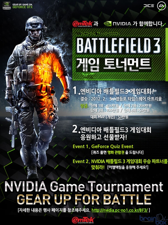 - 총 상금 800만원, 역대 최대 규모로 열리는 <배틀필드 3> 게임 토너먼트. 국내 컴퓨터 그래픽카드 시장을 선도하고 있는 (주)이엠텍아이엔씨(대표:이덕수, www.emtekinc.com)는 NVIDIA와 함께 <배틀필드 3 게임 토너먼트> 대회를 개최한다.