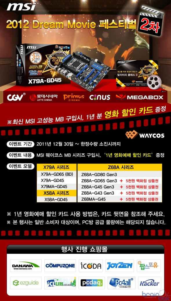 세계 정상급 토탈 IT 솔루션 제조사, MSI의 한국 공식 디스트리뷰터인 ㈜웨이코스(대표:고민종)가 MSI 고성능 메인보드 제품을 구입하면 매달, 1년간 영화를 볼 수 있는 영화예매 할인 카드를 증정하는 2차 특별 행사를 실시한다.