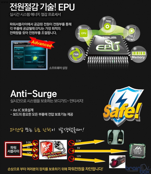 특히 하드웨어 방식의 안티 서지 칩셋은 파워 서플라이에서 인가되는 시점과 각 부품들에 공급되는 시점에서의 3.3V , 5V , 12V 전압에 대해서 갑작스럽게 발생하는 서지 전압이 부품들에 손상을 주지 않도록 빠르게 보호해 주는 기능이다.