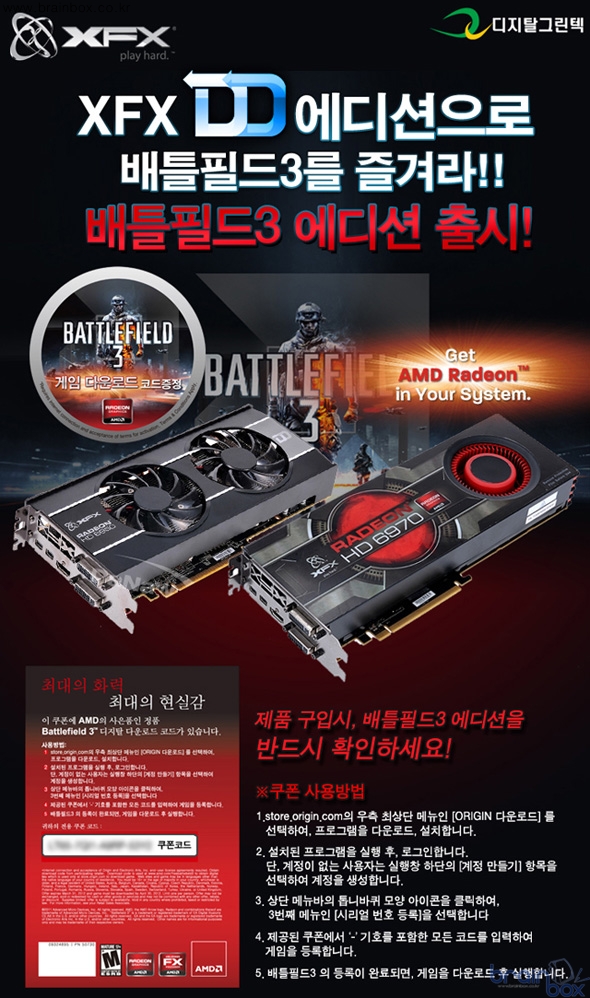 세계 최고의 품질을 자랑하는 XFX VGA의 국내 공식 디스트리뷰터인 디지탈그린텍㈜(대표 이주영)에서는 2011년 하반기 최고의 FPS 대작게임 배틀필드3의 정식버전을 즐길 수 있는 XFX [배틀필드3 에디션] 패키지를 출시한다고 밝혔다. 출시전부터 뛰어난 그래픽으로 많은 기대를 한 몸에 받아온 2011년 하반기 최고의 대작게임, [배틀필드3]는 다이렉트X 11을 비롯하여, 3D스테레오 스코픽, 크로스파이어X, 아이피니티 등 AMD가 자랑하는 모든 GPU관련 기술을 바탕으로 화려한 그래픽과 몰입감 넘치는 게임환경을 구현하였다. 특히, PC와 플레이스테이션3, 엑스박스360등 멀티플랫폼으로 출시한 타이틀로는 이례적으로 PC에서 가장 좋은 그래픽을 낼 만큼 그래픽 관련 기술을 잘 활용했다는 평가다.