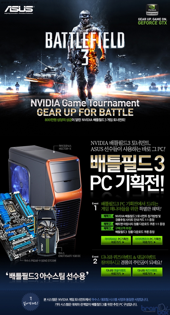 ASUS, NVIDIA와 함께 배틀필드3 게임대회 진행 ASUStek사의 국내유통사인 에스티컴퓨터(http://www.stcom.co.kr , 대표 서희문)는 NVIDIA와 공동으로 배틀필드3 게임 대회 "NVIDIA Game Tournament GEAR UP FOR BATTLE"을 개최하고 다양한 이벤트를 진행한다. 게임대회 예선을 통과하는 한 팀은 게임대회 기간 동안 ASUS(STCOM)의 공식후원을 받게 된다.