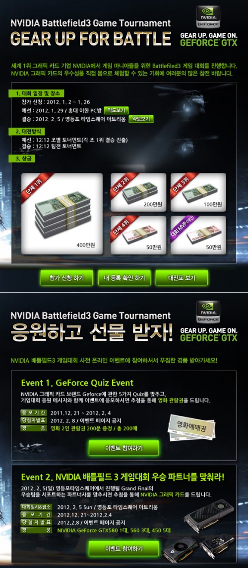 이 밖에 엔비디아 게임대회 참가신청 페이지 내에서는 이번 배틀필드3 게임 토너먼트의 성공적인 유치 및 지포스 유저들께 더 많은 혜택을 드리고자 영화관람권 200매를 드리는 퀴즈 이벤트, 게임대회 우승팀을 맞추는 분들을 위한 엔비디아 그래픽카드 경품이벤트를 동시에 진행한다.
