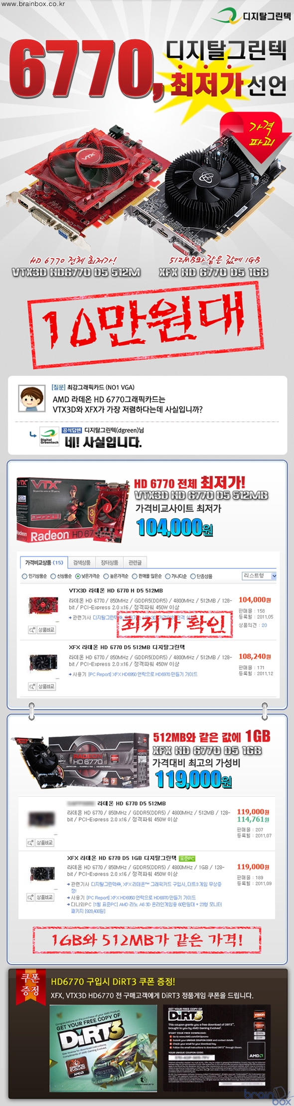 특히, 이번 가격인하를 통해 VTX3D HD6770 D5 512MB 제품은 HD6770을 통틀어 가장 저렴한 104,000원에 판매되며, XFX의 HD6770 D5 1GB 제품은 경쟁사의 512MB 제품과 동일한 118,000원에 판매된다. 뿐만아니라, HD6770 시리즈 전 구매고객을 대상으로 4만원 상당의 인기 레이싱게임 DiRT3의 정품 다운로드 쿠폰을 무상 증정한다. 디지탈그린텍㈜ 마케팅 담당자는 "2011년 한 해 동안, VTX3D와 XFX에 보내주신 고객님들의 사랑에 보답하기 위해, 메인스트림 시장의 인기제품인 HD6770의 가격을 대폭 인하하였으며, 전 구매 고객님께 4만원 상당의 DiRT3 게임쿠폰을 함께 증정해드리는 만큼 많은 관심과 성원을 부탁드립니다." 라고 전했다. 디지탈그린텍㈜이 공급하는 VTX3D, XFX 그래픽카드 전 제품은 3년간의 무상보증서비스를 지원받을 수 있으며, 제품 및 이벤트에 대한 문의는 디지탈그린텍 홈페이지 및 영업부 (www.dgreentech.co.kr / 02-715-9327) 을 통해 가능하다. |