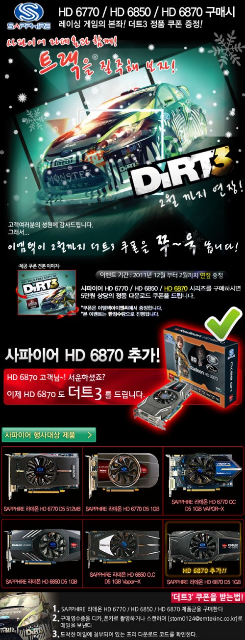 이엠텍아이엔씨(대표 이덕수 www.emtekinc.com)는 사파이어 라데온 HD 6000 시리즈 그래픽카드를 구입하면 인기 레이싱 게임 DiRT3를 무료로 제공하고 있는 행사를 2월까지 연장 한다.