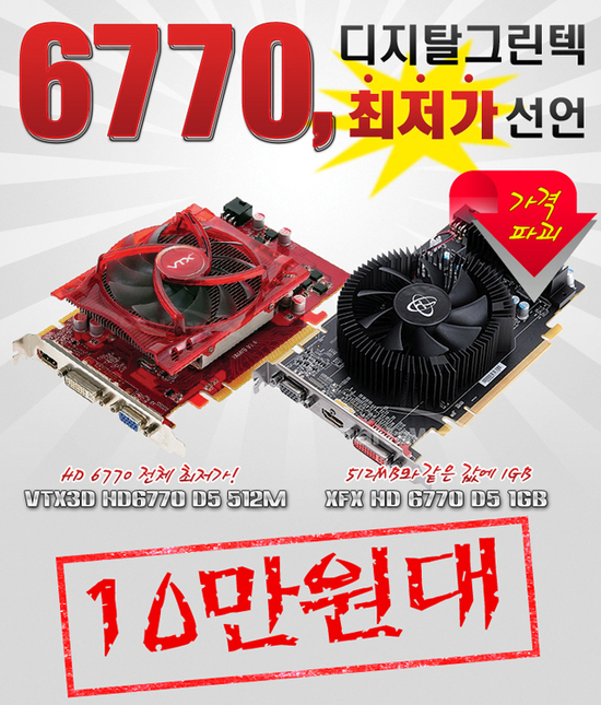 가격인하를 통해 'VTX3D HD6770 D5 512MB'는 10만 4000원에 판매되며, 'XFX HD6770