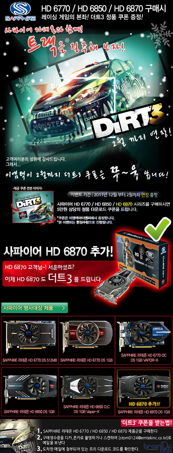 - 라데온 HD 6870, 6850, HD 6770 구매 고객에게 <DiRT3> 정품 게임 쿠폰 증정 국내 컴퓨터 그래픽카드 시장을 선도하고 있는 (주)이엠텍아이엔씨(대표:이덕수, www.emtekinc.com)는 사파이어 라데온 HD 6000 시리즈 그래픽카드를 구입하면 인기 레이싱 게임 <DiRT3>를 무료로 제공하고 있는 행사를 2월까지 연장 진행한다. 특히 행사 연장 진행과 더불어 쿠폰 증정 대상 제품을 확대하여 라데온 HD 6870 제품까지 추가하였다.