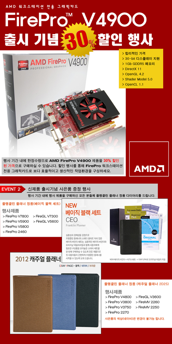 30% 가격 인하뿐 아니라 2012년 다이어리 증정까지. 전문가용 그래픽카드가 필요한 학생이나 직장인 또는 디씨인이라면 2012년 첫 자신에게 하는 선물을 FirePro와 프랭클린 다이어리로하는 것은 어떨까?