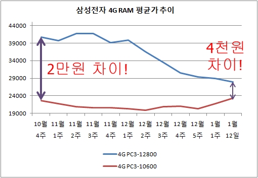4G PC3-10600 메모리는 반대로 가격이 오르고 있어 두 제품 사이의 가격 갭은 점점