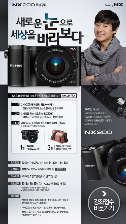 삼성카메라 사용자는 누구나 응모 가능한 이번 이벤트는 오는 20일까지 삼성NX200 마이크로사이트(www.nx200.co.kr)의 해당 이벤트 페이지에서 간단한 개인정보 입력 시 응모 가능하다. 최종 당첨자는 25일 마이크로사이트를 통해 발표 될 예정이다.