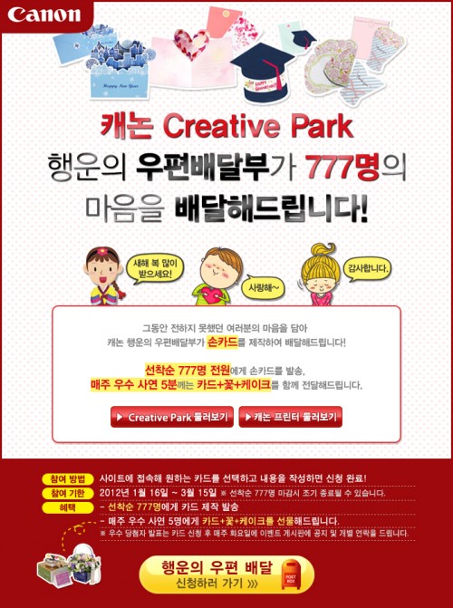 캐논 Creative Park 행운의 편지배달부 이벤트는 캐논 DSLR Printer 마이크로 사이트 (www.canon-bs.co.kr/DslrPrinter/Event/Default.aspx)에 접속해 원하는 Creative Park 카드를 선택하고 편지 내용을 작성하면, 캐논 행운의 우편배달부가 손카드를 직접 제작해 배달해 준다.