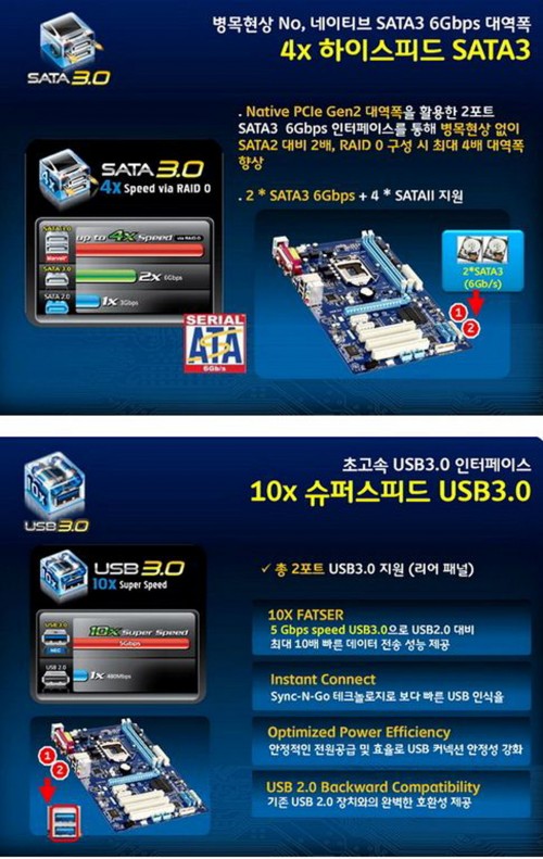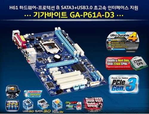새롭게 출시된 GA-P61A-D3 메인보드는 초고속 USB 3.0 인터페이스를 지원하여 USB 2.0 대비 최대 10배 빠른 데이터 전송 속도와 안정적인 전원 공급 및 효율로 USB 커넥션 안정화를 강화한 것이 특징이다. 또한 네이티브 SATA3 6Gbps 인터페이스를 통해 병목현상 없이 SATA2 대비 2배, RAID 0 구성시 최대 4배 대역폭이 향상 되어 현재 출시된 초고속 인터페이스와 완벽한 호환성을 자랑한다.
