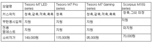 Scorpius M10G 는 청축(클릭)을 시작으로 사용자들의 요구사항을 검토하여 차후 다른 스위치들도 출시할 예정. 청축의 경우 탄력 있는 키압과 경쾌한 소리로 타이핑의 즐거움을 주는 스위치로 가장 기계식 느낌이 강하며 제일 인기 있는 스위치로 특히 FPS게임을 하시는 분들이 가장 선호하는 스위치이기도 하다.