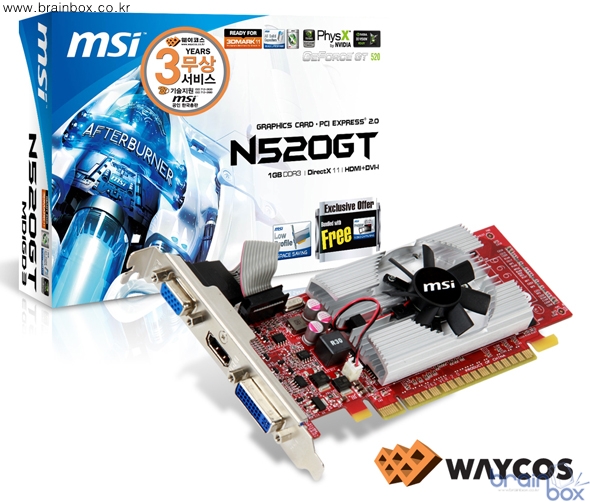 세계 정상급 토탈 IT 솔루션 제조사, MSI의 한국 공식 디스트리뷰터인 ㈜웨이코스(대표:고민종)가 NVIDIA 보급형 그래픽 코어인 지포스 GT 520 코어를 장착하고 LP 디자인으로 제작된 “MSI N520GT 슬림 1G/LP” 그래픽 카드를 출시했다. LP 타입 디자인, 미니 HTPC 구성에 적합