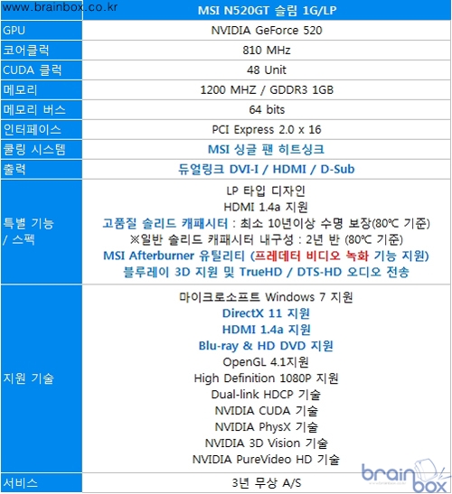MSI N520GT 슬림 1G/LP 제품은 LP 타입 디자인을 채택하여 작은 사이즈를 제공하기 때문에, 최소한의 공간만을 차지하는 슬림 PC 나 미니 HTPC 구성에 적합한 특성을 제공한다. (LP 브라켓 기본 제공) DirectX 11 / HDMI 1.4a / TrueHD 및 DTS-HD 오디오 전송 지원