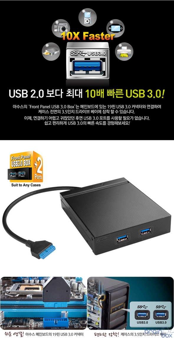 ASUStek사의 국내유통사인 에스티컴퓨터(http://www.stcom.co.kr , 대표 서희문)는 케이스 앞면에서 간편하게 USB 3.0을 사용할 수 있는 프론트패널 USB3.0 박스를 출시했다.