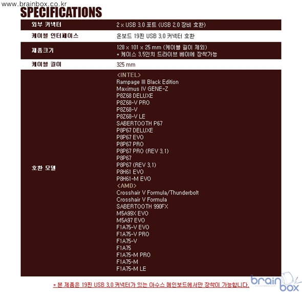이 제품은 19핀 USB 3.0 커넥터가 설치된 아수스 메인보드와 호환되며, 컴퓨터 케이스 3.5인치 드라이브 베이에 설치해 사용 할 수 있다. USB 3.0은 USB 2.0의 비해 최대 10배 향상된 성능을 보여준다. 특히 아수스는 P8Z68-V GEN3, MAXIMUS ⅣGENE-Z GEN3 메인보드 등에 적용된 아수스 USB 3.0 부스트 드라이버 기술을 통해 타사와 차별화되는 속도와 안정성을 보여주고 있다.