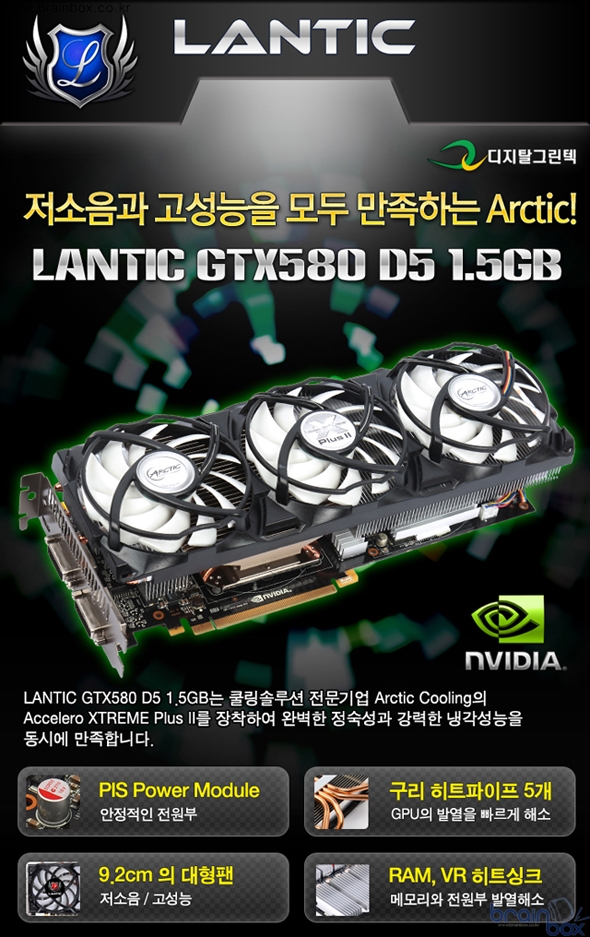 - 시중가 9만원대, Arctic Cooling Accelero XTREME Plus II 기본장착 LANTIC 그래픽카드의 국내 공식 디스트리뷰터인 디지탈그린텍㈜(대표 이주영)은 시중에서 9만원대에 판매되고 있는 Arctic Cooling의 고성능 그래픽 쿨러를 탑재한 [LANTIC GTX580 D5 1.5GB]를 출시했다. [LANTIC GTX580 D5 1.5GB]에 사용된 nVIDIA의 GTX580 GPU는 512개의 쿠다프로세서를 바탕으로 강력한 성능을 자랑하며, 다이렉트X 11과 nVIDIA CUDA, PhysX, Surround, 3D Vision등의 다양한 기술을 지원하여, 실감나는 게이밍 환경을 제공한다. 또한, 1536MB에 달하는 GDDR5메모리는 최신 3D게임 및 3D응용 프로그램이 필요로하는 충분한 그래픽 버퍼를 제공한다.