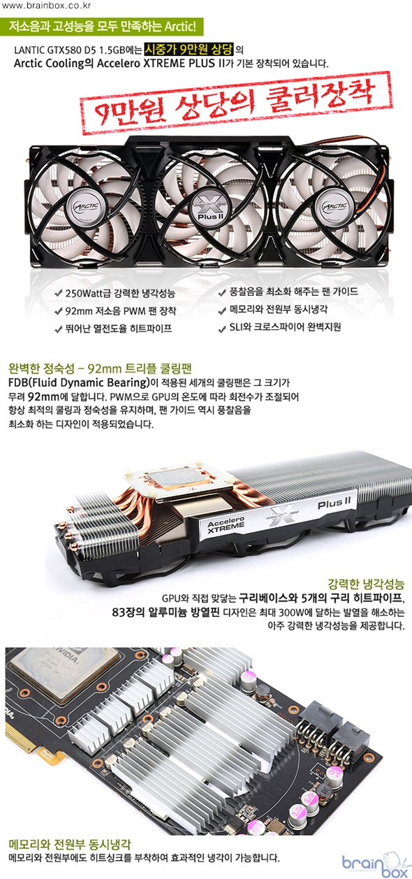 무엇보다도, [LANTIC GTX580 D5 1.5GB]는 시중가 9만원 대에 판매되는 Arctic Cooling의 Accelero XTREME Plus II를 기본 장착하여 냉각성능을 크게 높였다. GPU와 직접 맞닿는 구리 히트베이스와 5개의 구리 히트파이프, 83장의 알루미늄 방열핀으로 구성된 Accelero XTREME Plus II은 최대 300W에 달하는 발열을 해소하는 강력한 냉각성능을 자랑하며, FDB(Fluid Dynamic Bearing)이 적용된 92mm 지름의 세개의 쿨링팬은 PWM을 지원, GPU온도에 따라 회전수를 달리하며 최적의 쿨링과 정숙성을 유지한다.