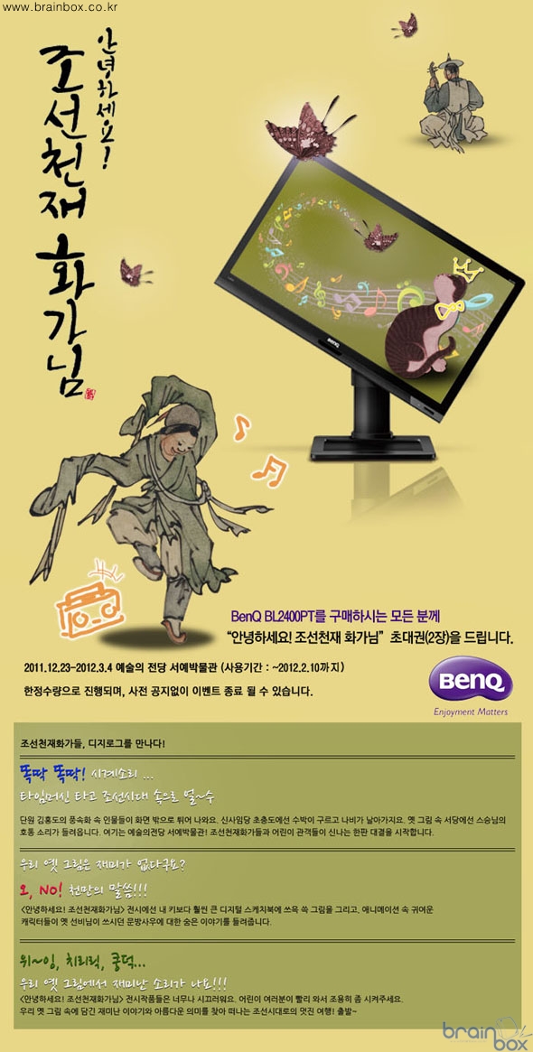이외에도 주변 밝기에 따라 자동으로 화면 밝기를 조정하는 센서와 사용자를 감지하여 화면을 켜고 꺼주는 센서가 적용되어 있어 전력 절감 및 보안에도 탁월한 성능을 제공한다. 사은품은 벤큐코리아가 협찬하고 예술의 전당에서 진행되는 "안녕하세요! 조선천재 화가님" 전시회 초대권 2장이며, 우리의 문화 유산을 통해 어린이들의 상상력을 자극해주는 인터랙티브 미술전이다.<끝> |