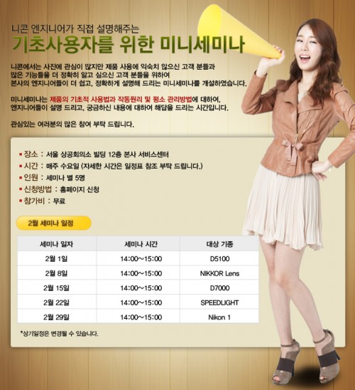 2월부터 매주 진행되는 강좌는 DSLR D5100, D7000 및 Nikon 1 V1, Nikon 1 J1등의 카메라 기기와 NIKKOR렌즈, 스피드라이트 등의 액세서리를 주제로 진행되며 신제품이 출시되는 경우 최신 제품으로 강좌가 변경된다.
