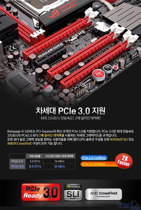 차세대 PCIe 3.0 규격도 지원된다. PCIe 3.0은 최대 전송속도가 32 GB/s로써 지난 PCIe 2.0 규격보다 2배 늘어난 대역폭을 사용하는 차세대 규격이다. 이와 엔비디아 SLI 및 AMD 크로스파이어X 기술을 지원하며 듀얼 그래픽카드를 사용할 때에도 두 그래픽카드 모두 x16의 최대 대역폭을 낼 수 있다.