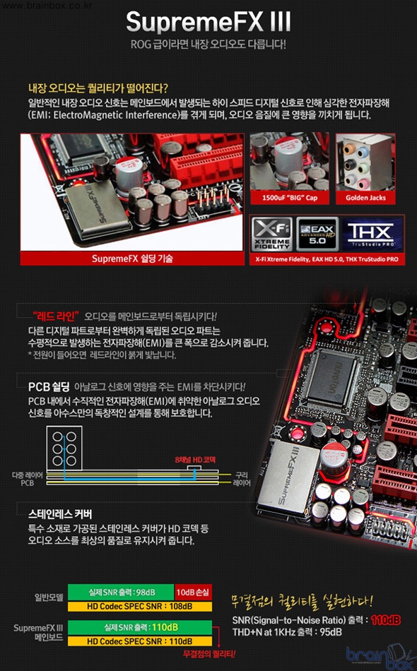 이런 뛰어난 메인보드 설계와 더불어 최강의 사운드카드 칩셋인 Supreme FX Ⅲ를 탑재해 110bB 무결점 출력을 자랑한다. 또한 출력단자 금도금이 되어 있어 더욱 뛰어난 음질을 들려준다.