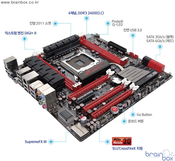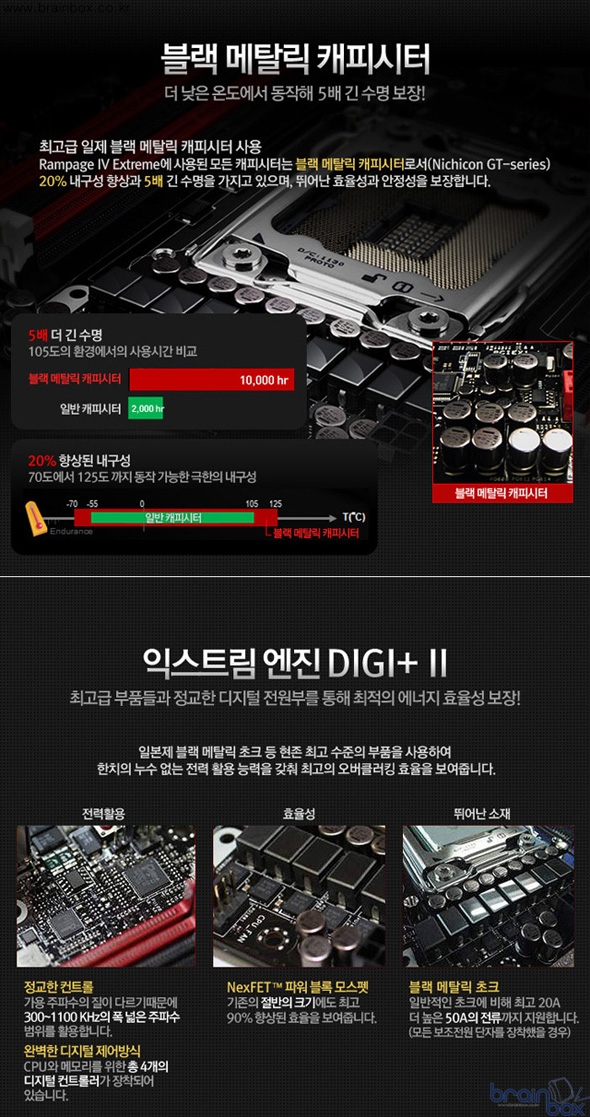 익스트림 엔진 Digi+ Ⅱ전원부에는 총 4개의 디지털 전원부 컨트롤러가 탑재되어 오버클러킹을 위한 가장 정교하고 극대화된 전력 효율성을 보장해준다. 일본산 블랙 메탈릭 초크는 일반 초크에 비해 높은 내열성과 내구성을 통해 5배 길어진 수명과 2.5배 향상된 성능을 갖추고 있다. 강렬한 레드라인과 대비를 이루는 고급스러운 블랙 메탈릭 디자인으로 아수스 ROG 등급 메인보드의 품격을 느낄 수 있을 것이다.