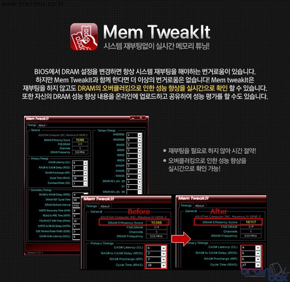 또한 시스템 재부팅 없이 메모리 설정값을 조절하고 그 변화된 성능 차를 실시간으로 확인 가능한 Mem TweakIt 기능 등의 최신 기능도 탑재되었다. |