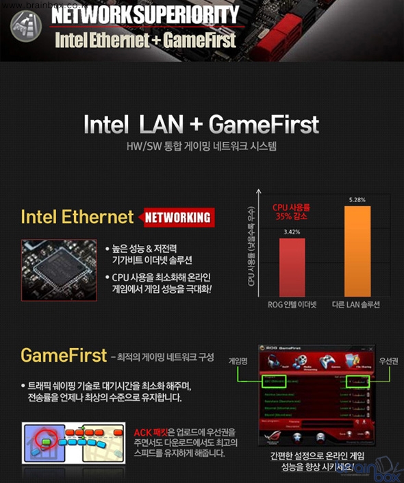 마이크로mATX 타입의 미니보드지만 고급 게이머를 위한 ROG 등급의 설계 철학답게 게이머를 위한 다양한 부가기능을 갖추고 있다. 게임퍼스트 기능은 네트워크의 흐름을 관리해 온라인 게임도중 불필요한 랙을 감소시켜주는 기술이다. 이와 동시에 인텔 기가비트랜을 탑재해 일반 표준 랜 대비 CPU 사용률을 35% 가량 감소시켜 상대적으로 CPU의 성능을 강화해 준다.