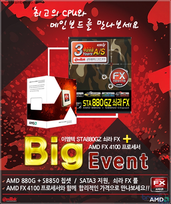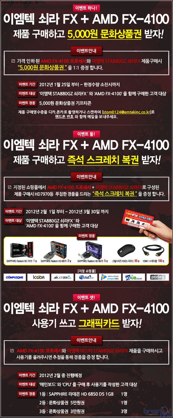 - AMD FX-4100 CPU와 동시 구입시 5000원 문화 상품권 전원 증정 국내 컴퓨터 컴포넌트 시장을 선도하고 있는 (주)이엠텍아이엔씨(대표:이덕수)는 자사의 베스트셀러 AMD 메인보드인 <EStar STA880GZ 쇠라 FX>의 판촉을 위한 대대적인 행사를 진행한다.