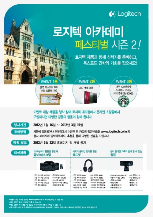 로지텍코리아(대표 박재천 www.logitech.co.kr)는 졸업, 입학 및 신학기를 맞이하여 행사제품 구매 고객을 대상으로 추첨을 통해 영국 옥스포드 투어 상품권 등 다양한 경품을 증정하는 ‘로지텍 아카데미 페스티벌’을 오는 3월 15일까지 진행한다.