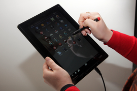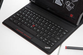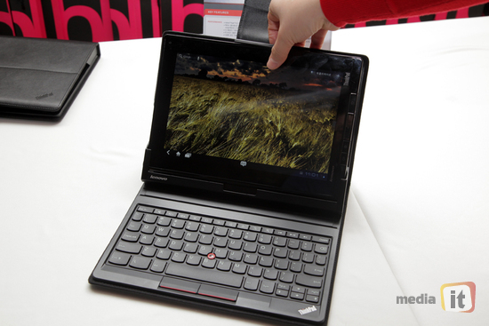 ▲ 레노버는 키보드와 결합하면 노트북과 모양이 비슷한 태블릿 '씽크패드 태블릿'을 기자간담회서 선보였다.