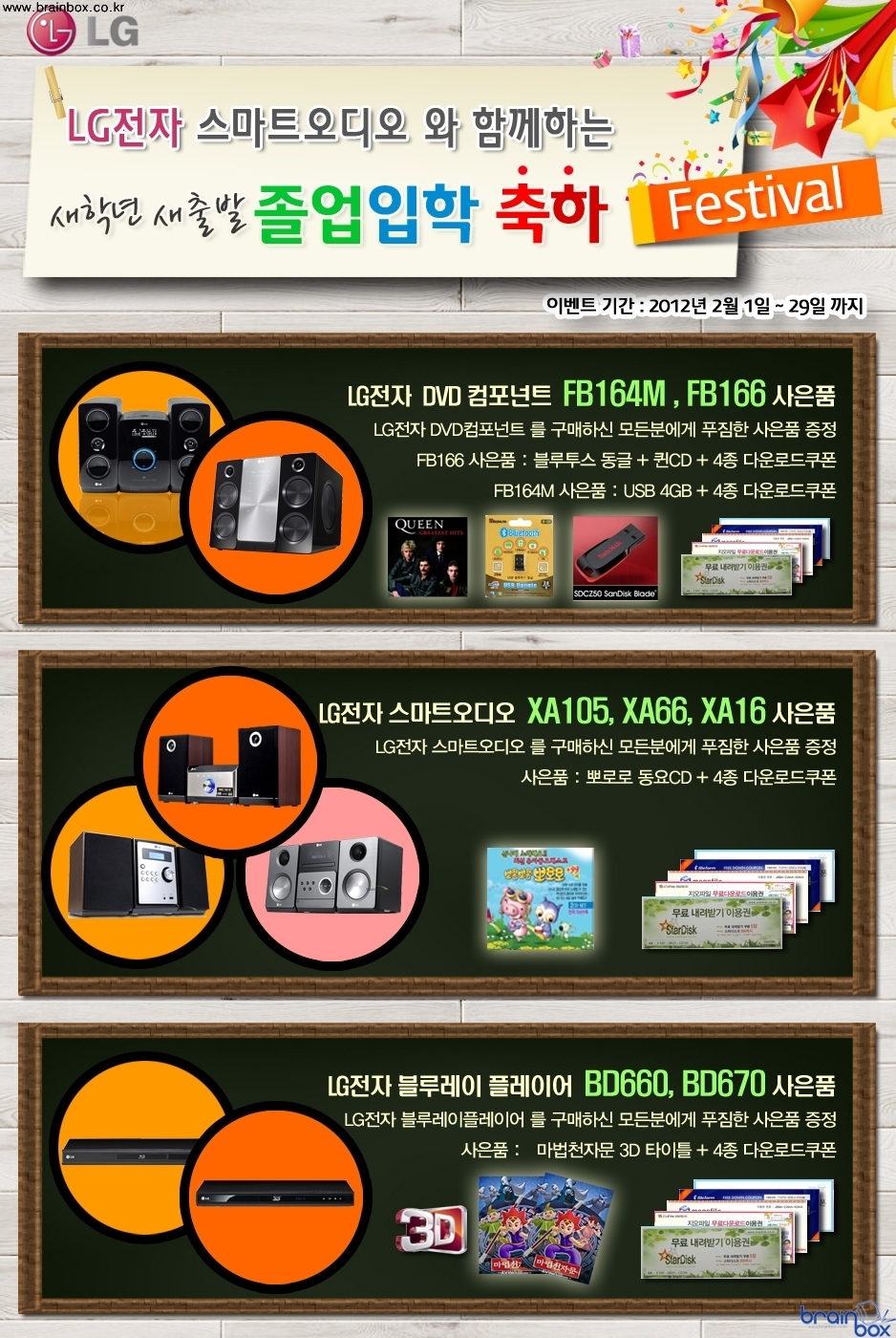 졸업/입학 시즌에 맞춰 LG전자 오디오 구입시 다양한 사은품 증정 판매, 유통전문 가림토(http://karimto_inc.blog.me)는 졸업 입학을 맞아 LG전자 오디오 구매시 다양한 선물을 증정하는 ‘졸업 입학 축하 페스티벌’을 펼친다. 이번 행사는 곧 있을 졸업 및 입학에 맞춰 LG전자 스마트오디오의 우수성을 널리 알리기 위해 기획됐다. LG전자 스마트오디오는 최근 스마트 디자인 트랜드에 맞춰 크기는 줄이고 깔끔하게 멋을 낸 것이 특징. 또한 다양한 기능을 내장 해 똑똑한 오디오(Smart Audio)로 불리기에 전혀 손색없다. 이번 이벤트 기간동안 LG전자 FB164M 구매고객에게는 USB메모리 4GB를, FB166은 오디오에서 무선으로 PC의 음악을 들을 수 있도록 블루투스 USB동글을 제공한다. FB166의 경우는 현장감 넘치는 퀸 베스트 음반을 1+1 행사로 같이 받아볼 수 있다. FB164M은 오디오 하나로 음악과 동영상을 모두 재생하는 DVD컴포넌트로, 160W의 강력한 출력을 자랑한다. 깔끔한 디자인과 똑똑한 성능을 담은 스마트오디오로 아이팟/아이폰 독을 내장했으며, CD 및 DVD, MP3 파일을 재생한다. FM 라디오 감상은 물론, 강력한 성능의 USB 다이렉트 레코딩을 지원해 CD의 음악을 MP3 파일로 변환해 USB 메모리에 저장한다. FB166보다 가격이 저렴해 구매 부담이 적은 것도 큰 장점이다. CD 컴포넌트인 XA105 / XA66 / XA16 구매자에게는 아이들이 좋아하는 동요CD와 다운로드 상품권을 증정한다. 또, 3D / 스마트 블루레이 플레이어 BD660 / BD670 의 경우 3D 블루레이 애니메이션 타이틀인 마법천자문을 각각 증정 한다. 행사기간은 졸업과 입학 시즌인 2월 한달 간이며, 마련된 선물이 모두 소진되면 이벤트는 자동 종료된다. 가림토 영업팀의 손성제차장은 “졸업과 입학에 좋은 선물이 될 수 있도록 이벤트를 준비했으니 꼭 참여해 혜택을 받았으면 좋겠다”고 말했다.