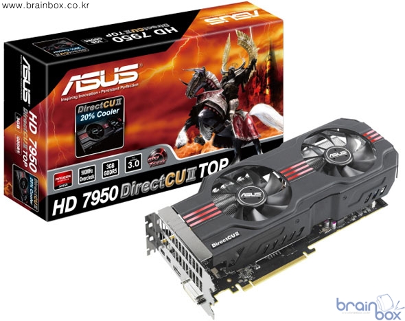 - 아수스 독자 개발 GPU Tweak 기술로 최대 900MHz까지 오버클럭 가능 2011년 2200만대의 마더보드를 선적하며 전세계 마더보드 및 그래픽 카드 시장을 선도하고 있는 아수스는 AMD의 새로운 HD7950 (코드명 : 타히티) GPU와 아수스가 자랑하는 DirectCU II 써멀 아키텍쳐와 DIGI+VRM 12페이지 디지털 파워가 결합돼 최대 900MHz까지 GPU 오버클럭킹이 가능한 ‘아수스 HD 7950 DirectCU II TOP’을 출시한다고 발표했다. 이번에 새롭게 출시한 아수스 HD7950 DirectCU II TOP은 세계 최초의 28nm 공정 GPU인 HD7970과 동일한 공정이 적용된 HD7950 GPU, 아수스가 독자적으로 개발한GPU Tweak 오버클럭킹 기술, DirectCU II 쿨링 기술 그리고 이를 뒷받침하는 DIGI+VRM 12페이즈 디지털 파워까지 더해져 레퍼런스 GPU 클럭 대비 약 10% 이상 높은 900MHz의 고클럭에서도 안정적인 동작이 가능한 최신 그래픽 카드이다. 이 그래픽 카드가 채용하고 있는 PCI 익스프레스 3.0 인터페이스는 기존 2.0 대비 2배인 32GB/s의 대역폭을 제공해 고해상도의 게임에서 발생할 수 있는 3D 데이터의 정체를 완전히 해소했다. 또한, AMD Eyefinity™ 6를 네이티브로 지원해 별도의 어댑터 없이도 최대 6개의 모니터를 쓸 수 있는 것도 큰 장점이다.