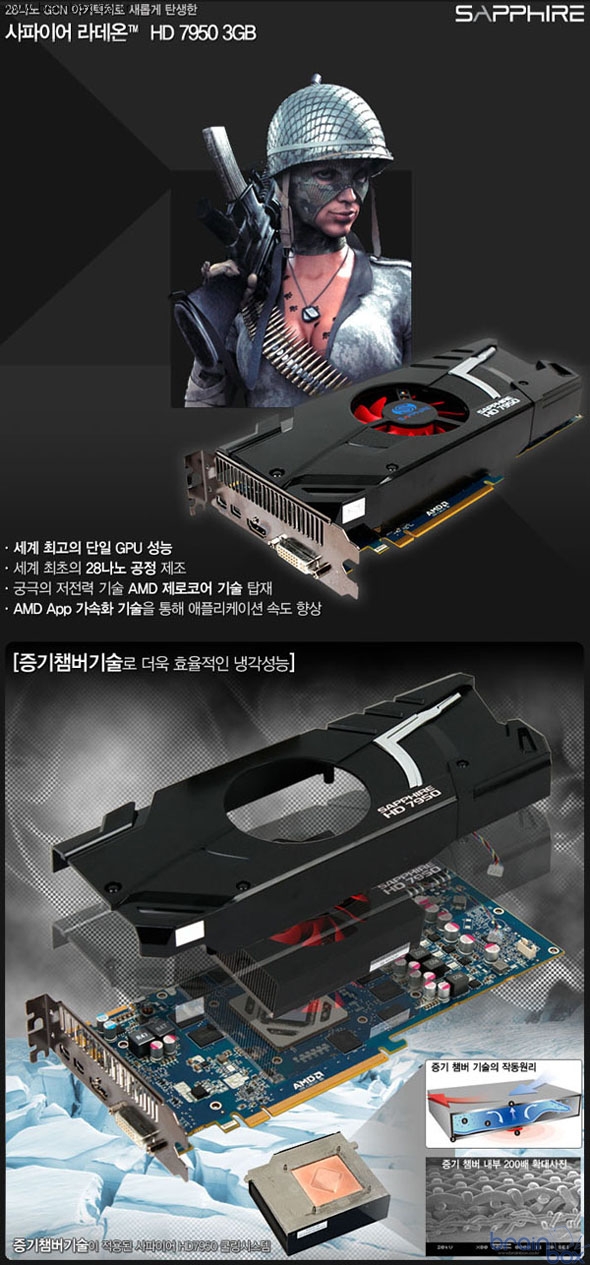 - 28nm GCN 아키텍쳐로 탄생한 라데온 HD 7000 시리즈의 두 번째 고성능 그래픽카드 국내 컴퓨터 그래픽카드 시장을 선도하고 있는 (주)이엠텍아이엔씨는 AMD의 라데온 HD 7000 시리즈의 두 번째 고성능 그래픽카드인 <SAPPHIRE Radeon HD 7950>을 1월 31일 공식 발표일에 맞춰 출시하였다.
