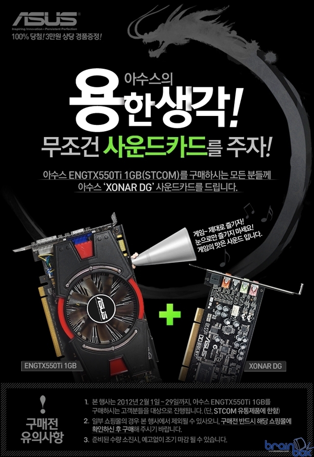 ASUStek사의 국내유통사인 에스티컴퓨터(http://www.stcom.co.kr , 대표 서희문)는 2월 1일부터 ASUS ENGTX550Ti 1GB를 구매하는 모든 고객에게 아수스 XONAR DG 사운드카드를 1:1 증정하는 이벤트를 진행한다. ASUS ENGTX550Ti 1GB 그래픽카드는 게이밍 그래픽카드 라인인 "GTX"급의 그래픽카드 중 가장 대중적인 모델로써 앞으로 출시되는 디아블로3 등 대작 게임을 즐기는 최적화된 그래픽카드라는 평을 얻고 있다. 특히 이 그래픽카드는 아수스만의 특수한 전원부 설계인 슈퍼알로이 파워가 도입된 모델로써 일반 그래픽카드에 비해 15% 성능향상, 최대 35도 더 낮아진 부품 동작 온도 등 내구성과 성능이 월등히 강화된 모델이다. 이번 프로모션은 소비자들에게 게임의 진정한 "맛"을 소비자들에게 전달하자는 의미로 기획됐다. 사운드카드를 사용할 경우 일반적으로 게임의 소리가 풍부해지고 5.1, 7.1 채널 이상의 스피커를 사용하게 되면 그 진가를 느낄 수가 있다. 이번 프로모션은 2월 1일 본사 출고 제품부터 적용되며, 한정 수량으로 진행되어 조기 종료될 수 있다. 또한 일부 쇼핑몰의 경우 이벤트 대상에서 제외될 수 있으니 구매 전 확인 해당 판매처에 이벤트 진행여부를 확인해 볼 것을 추천한다. 기타 이벤트 관련 문의사항 등은 에스티컴퓨터 이벤트 담당자 (JH_Choi@stcom.co.kr)에게 이메일을 통해 문의하면 된다.