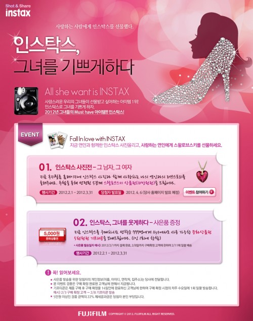 한국후지필름(대표 이창균 www.fujifilm.co.kr)은 발렌타인데이와 화이트데이 등 각종 기념일을 앞둔 연인의 달 시즌을 맞아 ‘인스탁스, 그녀를 기쁘게 하다’ 이벤트를 오늘부터 진행한다.