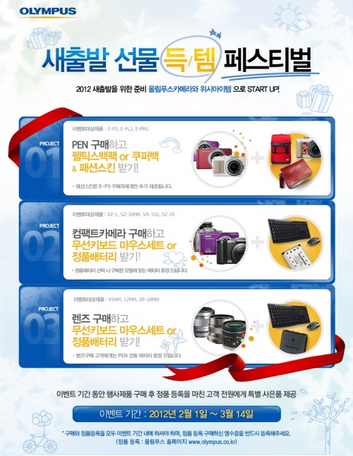 졸업입학 시즌에 맞추어 진행되는 이번 행사는 오는 3월14일까지 올림푸스 대표 하이브리드 DSLR 카메라 인 PEN 3종 시리즈 (E-P3, E-PL3, E-PM1)와, 렌즈, 컴팩트 카메라 등  제품을 구매한 고객이 정품등록을 완료하면 100% 사은품을 증정하는 특별 이벤트다.