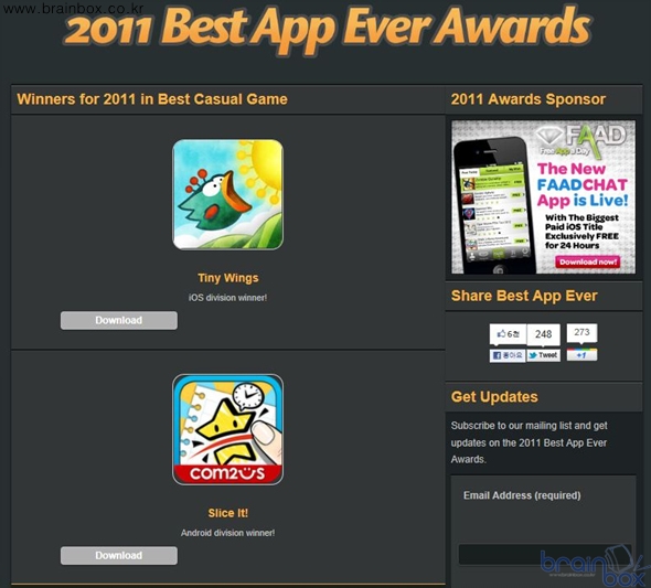 2011년 최고의 애플리케이션을 선정하는 [Best Ever App Awards] 에 국내 모바일 게임 기업 컴투스(대표 박