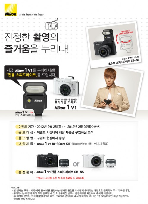 니콘이미징코리아(대표 우메바야시 후지오 www.nikon-image.co.kr)는 Nikon 1 V1을 구입하는 고객에게 전용 스피드 라이트 ‘SB-N5’를 증정하는 이벤트를 진행한다고 2일 밝혔다.