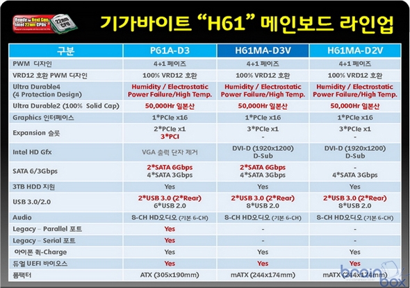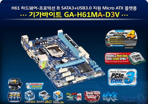 GIGABYTE Technology Co., LTD (이하 기가바이트)의 국내 공식 수입유통사인 제이씨현시스템(주)(대표:차현배)에서 SATA3/USB3.0 초고속 인터페이스와 차세대 아이비 브릿지 CPU를 완벽하게 지원하며, 기가바이트만의 하드웨어 프로텍션 기술인 Ultra Durable4 Classic 설계를 적용한 GA-H61MA-D3V 메인보드를 출시 하였다. GA-H61MA-D3V 메인보드는 초고속 인터페이스 USB3.0과 SATA3를 완벽하게 지원하는 프리미엄 제품으로써, 5Gbps speed USB3.0을 통해 USB2.0 대비 최대 10배 빠른 데이터 전송 속도는 물론 USB2.0과의 완벽한 호환성 유지 및 안정적인 전원공급을 강화 한것이 특징이다. 또한 6Gbps 대역폭의 SATA3의 지원으로 단일 SATA3 구성시 병목현상 없이 SATA2 대비 최대 2배의 속도를 구현하며 RAID 0 구성 시 최대 4배 대역폭 향상이 있어 짧은 시간 내에 초고속 데이터 전송이 가능하다. 또한, GA-H61MA-D3V 메인보드는 DIY PC에서 빈번히 발생할 수 있는 하드웨어에 기인한 오-동작을 최소화하기 위한 방습, 정전기 방지, 전원장애 보호, 발열 방지를 위한 4가지 하드웨어 프로텍션 설계로 엔트리 메인보드의 품질 혁신을 위한 얼티밋 프로텍션 Ultra Durable4 Classic 설계가 적용된 것이 특징이며, 기가바이트 메인보드 만의 USB 회로 설계로 최대 3배의 안정적인 USB 전원 공급 기술인 3X USB 파워부스트 설계가 적용되어 USB 장치 사용시 안정적인 장치 동작 가능은 물론 다수의 USB 장치 사용시 전원 공급 안정성을 배가하였다. 추가적으로, GA-H61MA-D3V 메인보드는 인텔 차세대 22nm CPU 아이비 브릿지 프로세서 및 PCIe GEN 3.0등 2012년 새롭게 선보일 차세대 신기술에도 대응하여, 가격과 성능은 물론 최신 사양의 PC를 구입하려는 소비자에게 큰 메리트를 제공한다. 마지막으로, GA-H61MA-D3V 메인보드는 100% VRD12 호환 PWM 디자인, 듀얼 UEFI BIOS, 아이폰 퀵-차지등 기가바이트만의 Unique Features들도 기존 제품과 같이 지원하며 출시 가격은 9만원 후반대(Open Price)에 출시 되었다. ▼ 기가바이트 GA-H61MA-D3V