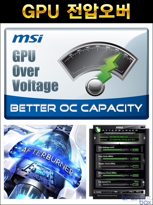 MSI R7950-2PMD3GD5/OC 그래픽카드는 더욱 빠른 3D 성능을 만끽하기를 원하는 소비자 계층을 위하여, 라데온 7950 VGA 중에서는 세계 최초로 GPU 전압오버 기능을 지원한다. 전 세계 오버클러커들에게 최고의 OC 유틸리티로 인정받고 있는 “MSI 애프터버너” 유틸리티를 통하여, MSI R7950-2PMD3GD5/OC 그래픽카드는 GPU 전압오버를 적용하여 더욱 높은 GPU 오버클럭에 도전할 수 있다. 세계 최초 28nm 제조공정 GPU