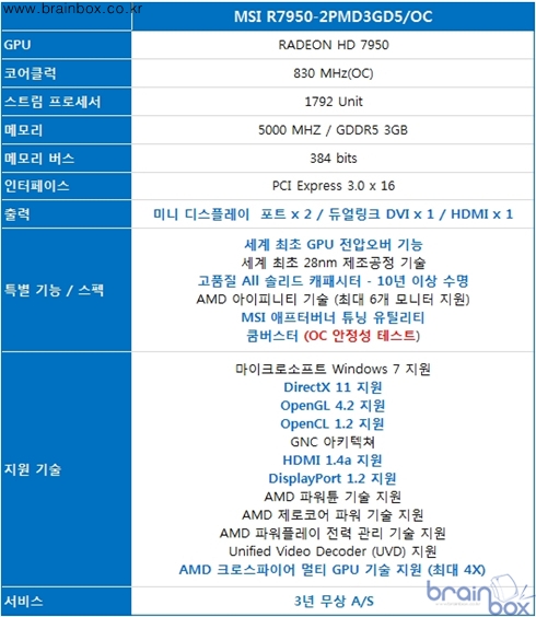 ※ MSI R7950-2PMD3GD5/OC 가격 정보 : http://blog.danawa.com/prod/1593257 MSI 공식 한국 디스트리뷰터인 ㈜웨이코스가 국내에 유통하는 MSI 그래픽카드는 타사 저가형 제품과 차별화된 3년 무상 A/S를 제공하며, 제품에 대한 더욱 자세한 내용은 웨이코스 홈페이지 (http://www.waycos.co.kr / 02-712-8999)을 참조하면 된다. |