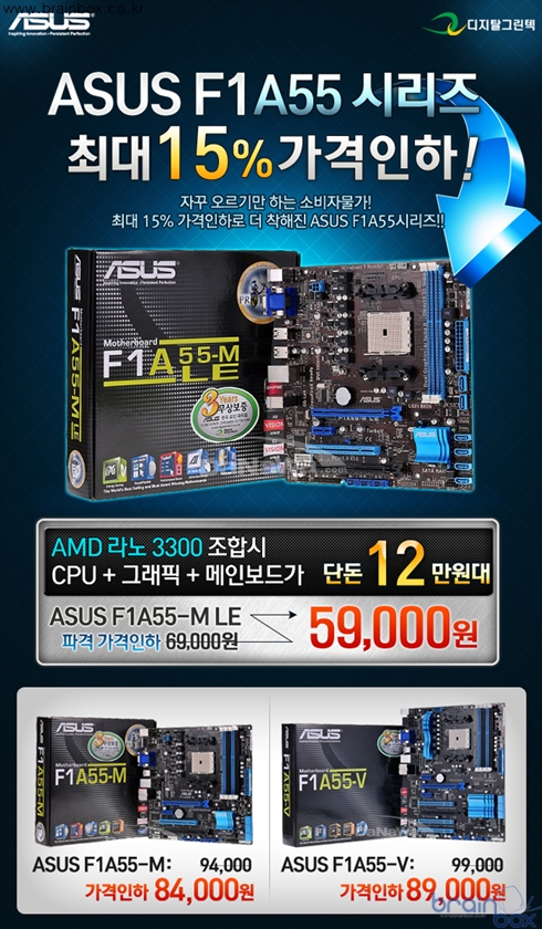 세계 최대의 메인보드 제조사 ASUS의 국내 공식유통사인 디지탈그린텍㈜(대표 이주영)은 AMD APU를 완벽히 지원하는, ASUS A55시리즈 메인보드의 파격적인 가격인하 계획을 밝혔다. AMD의 라노 APU는 멀티코어CPU, 외장형그래픽카드에 준하는 성능을 가진 GPU를 하나로 묶은 프로세서로, 다양한 업무, 엔터네인먼트, 게임 환경에 적용할 수 있다. 특히, DirectX11을 지원하는 내장그래픽은 더욱 생생하고 사실적인 게임플레이를 도와주며,1080p의 고화질 영상도 무리없이 재생할 수 있으며, Dual Graphics 기술을 통해 AMD의 외장형 그래픽카드를 추가하면 최대 175%의 성능을 낼 수 있어, 적은 비용으로도 고성능 PC를 만들 수 있다.