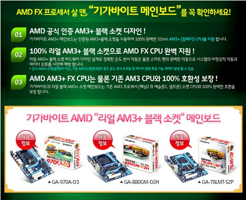 이번 확인하세요! AMD 공식 인증 기가바이트 AM3+ 블랙 소켓 캠페인에 소개된 블랙 소켓이 적용 된 기가바이트 AMD 메인보드에는 GA-970A-D3(11만원 중반), GA-880GM-D2H V4.0(6만원 후반), GA-78LMT-S2P V4.0(6만원 중반) 3종이 출시돼 있다.