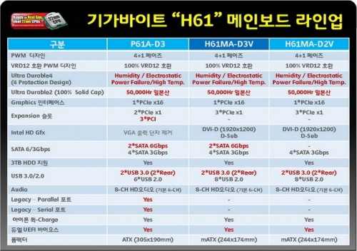 추가로 GA-H61MA-D3V는 인텔 차세대 22nm CPU 아이비 브릿지 프로세서 및 PCIe GEN 3.0 등과도 호한되는 특징을 가지고 있다. GA-H61MA-D3V 판매 가격은 9만원대 후반이다.