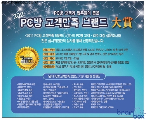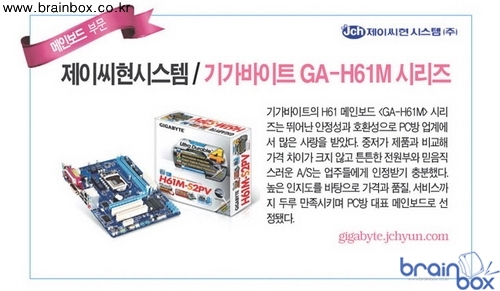 GIGABYTE Technology Co., LTD (이하 기가바이트)의 국내 공식 수입유통사인 제이씨현시스템(주)(대표:차현배)은 Ultra Durable 4 Classic 하드웨어 프로텍션 설계가 적용되어 하드웨어에서 발생 할 수 있는 오작동을 최소화한 GA-H61M-S2PV 등 기가바이트 H61 메인보드가 PC방 고객과 업주들이 직접 참가해 최고의 브랜드 제품을 선정하는 아이러브PC방 "2011 PC방 고객만족 브랜드 대상"에 선정 되었다고 밝혔다.