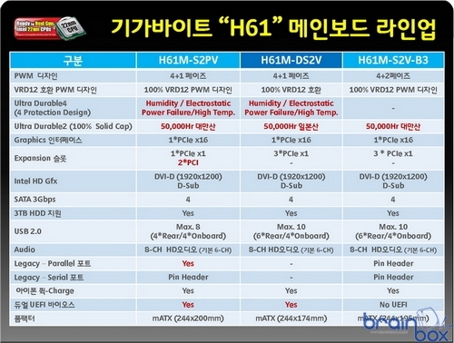 마지막으로, 이번 아이러브 PC 방 메인보드 부문 대상을 수상한 기가바이트 인기 H61 메인보드 시리즈에는 GA-P61A-D3 (9만원 후반대). GA-H61MA-D3V (8만원 후반대), GA-H61M-S2PV (6만원 후반대), GA-H61M-DS2V (5만원 후반대) 등 다양한 사양에 맞는 다양한 가격대에 출시되어 일반 소비자는 물론 PC방 업주분들에게 큰 인기와 함께 많은 판매를 보이고 있다.